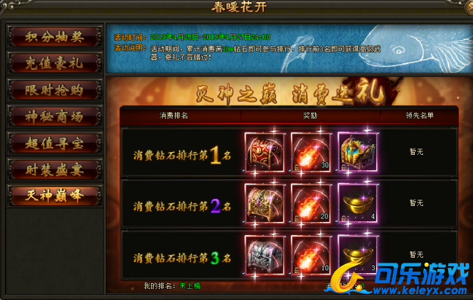 2. 活动期间内,累计消费满300000钻石即可参与排行,排行前3名的玩家可免费领取高级武器/灭神首饰箱、焚天异火、海量元宝等海量豪礼