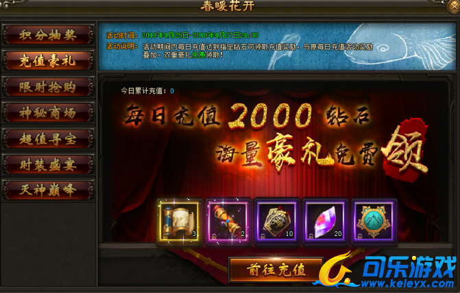 2. 活动期间内,每日充值达指定钻石数额,即可领取充值奖励,可原每日充值奖励叠加领取。