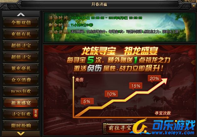 活动说明:活动期间,在龙族寻宝中,每寻宝5次,可额外获得1点祖龙之力,获取无上限!