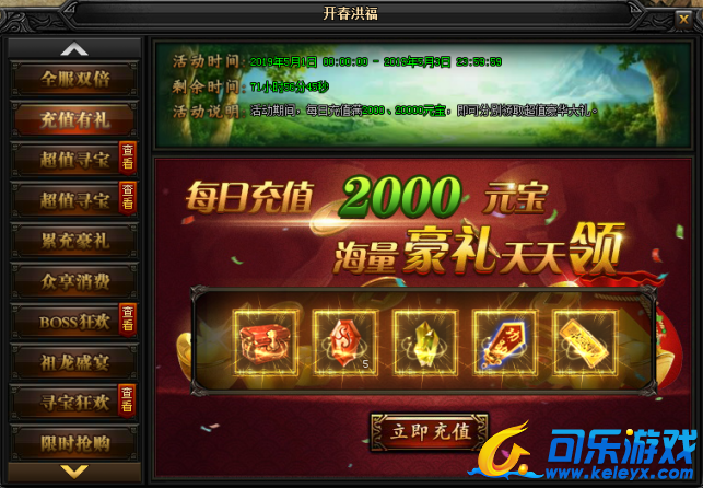活动说明:活动期间,每日充值满2000、20000元宝!还能领取超值豪华大礼