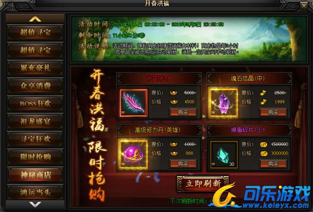 活动说明 : 活动期间,神秘商店倾情促销稀有材料!商店物品每2小时自动刷新(或全商品全部已购后),消耗一定元宝可手动刷新。