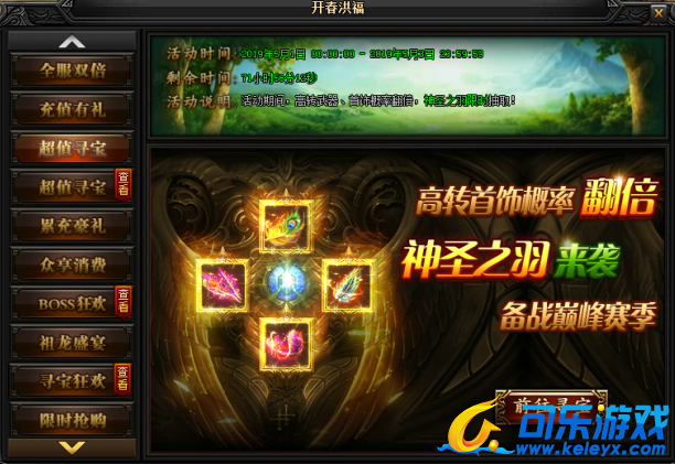 活动说明:活动期间,高转武器、首饰概率翻倍,神圣之羽限时抽取!