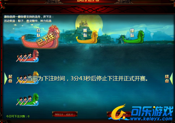 2. 活动开启的前五分钟为报名时间,届时可以选择三支队伍中你所支持的龙舟并下注。