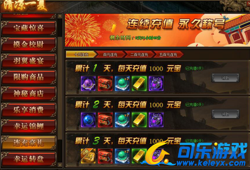 2.累积充值达到三天,奖励翻倍领,更可领取稀有称号(称号可淬炼)!