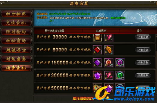 2. 活动期间内,消费指定档次的钻石可免费领取超级豪华礼包,更有灭神首饰箱、高级攻击宝石、韧性宝石、九霄妖核、救赎妖核等稀有道具
