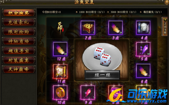 2. 活动期间内,玩家击杀boss可获得boss积分,boss积分数量达指定档次可免费投掷一次骰子,根据骰子点数可领取奖励。每日最多可获得三次