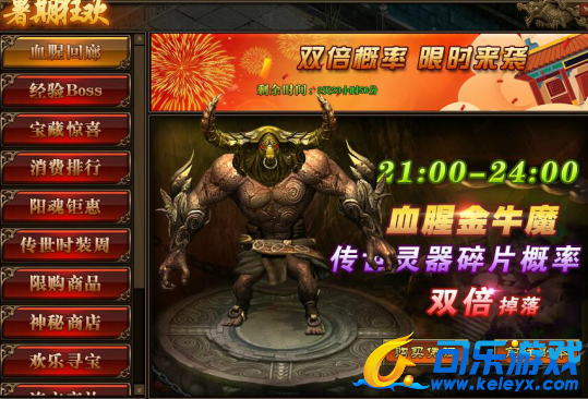 1.活动期间,玩家参与“多人副本-血腥回廊”,获得“传世灵器碎片”的概率翻倍;