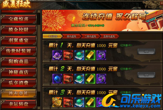 2.累积充值达到三天,奖励翻倍领,更可领取稀有称号(称号可淬炼)!