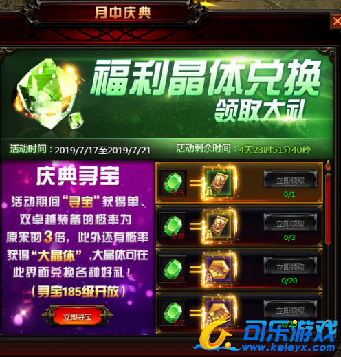 活动内容:在活动时间内,“寻宝”可获得单、双卓越装备的概率为原来的三倍,此外还有概率获得“大晶体”,大晶体可在月中庆典专属页面中兑换好礼,boss卡、远古晶石等你来拿!