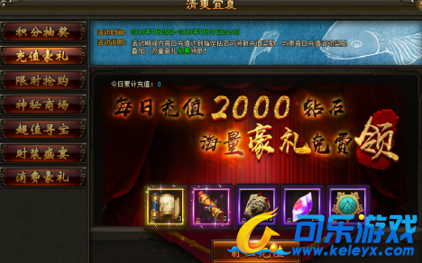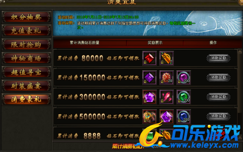 2. 活动期间内,消费指定档次的钻石可免费领取超级豪华礼包,更有灭神首饰箱、高级攻击宝石、韧性宝石、九霄妖核、救赎妖核等稀有道具