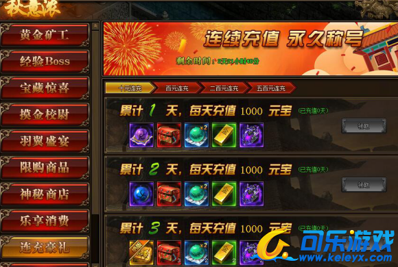 2.累积充值达到三天,奖励翻倍领,更可领取稀有称号(称号可淬炼)!