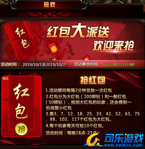 活动内容:玩家在活动期间,全服玩家同时抢金秋红包,每人每天最多抢10次,还有大大红包等你来抢!
