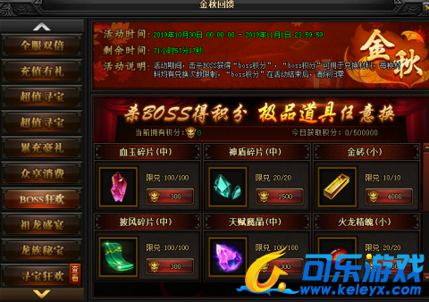 活动说明 : 活动期间内,击杀BOSS获得“boss积分”,“boss积分”可用于兑换材料,每种材料均有兑换次数限制,“boss积分”在活动结束后,清除归零