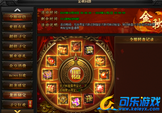 活动说明:活动期间,龙族寻宝次数达到指定次数可转动秘宝,转动转盘12次必定可领取所有秘宝转盘道具。