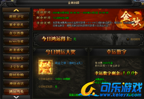 活动说明 : 玩家每消耗2688元宝即可获得一个1-100之间的幸运数字。每日21点抽取今日幸运数字,拥有该数字的玩家即可获得今日鸿运大奖。