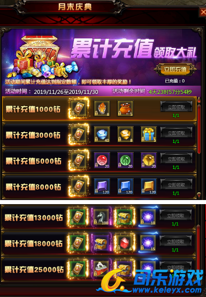 活动内容:玩家在活动时间内,累计充值达到一定钻石即可获得丰厚礼品!