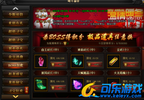 活动说明 : 活动期间内,击杀BOSS获得“boss积分”,“boss积分”可用于兑换材料,每种材料均有兑换次数限制,“boss积分”在活动结束后,清除归零