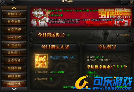 活动说明 : 玩家每消耗2688元宝即可获得一个1-100之间的幸运数字。每日21点抽取今日幸运数字,拥有该数字的玩家即可获得今日鸿运大奖。