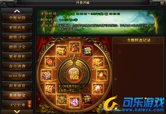 活动说明:活动期间,龙族寻宝次数达到指定次数可转动秘宝,转动转盘12次必定可领取所有秘宝转盘道具。