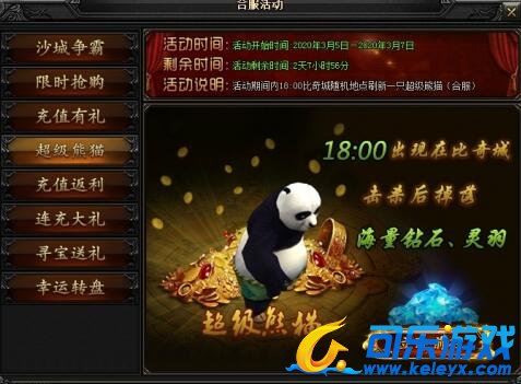 合服期间每天18:00,在王城随机地点刷新一只超级熊猫,击杀后掉落海量钻石