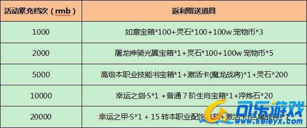 活动规则:活动期间累计领取元宝达到指定价值档次,即可在活动结束后联系客服申请返利道具