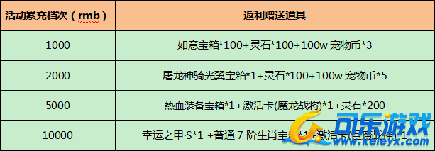 活动规则:活动期间累计领取元宝达到指定价值档次,即可在活动结束后联系客服申请返利道具