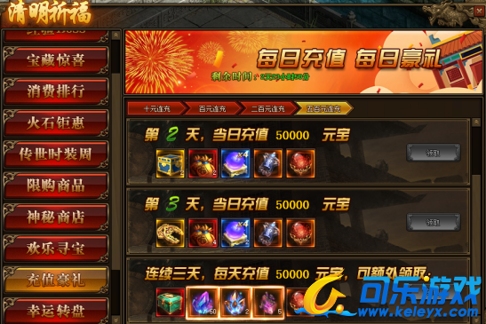 2.连续充值达到3天,奖励翻倍领,更可领取暗影晶石、地狱晶石、随机阵法宝珠宝箱等贵重物品