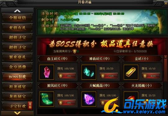 活动说明 : 活动期间内,击杀BOSS获得“boss积分”,“boss积分”可用于兑换材料,每种材料均有兑换次数限制,“boss积分”在活动结束后,清除归零