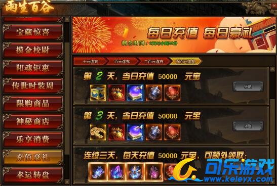 2.连续充值达到3天,奖励翻倍领,更可领取暗影晶石、地狱晶石、雷霆装备等贵重物品