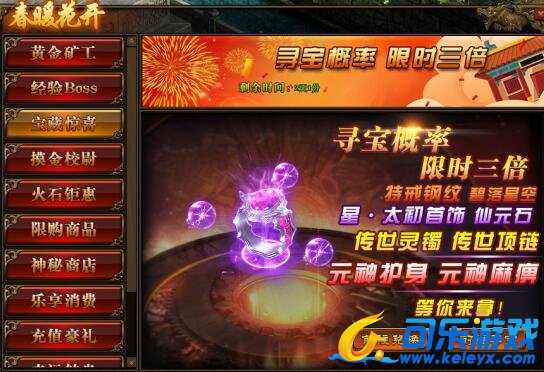 1.活动期间,玩家寻宝概率翻倍,极高几率获得星·太初首饰,传世灵器、传世灵甲,特戒钢纹,仙元石、碧落星空,传世灵器、传世灵甲,元神护身特戒以及元神麻痹特戒