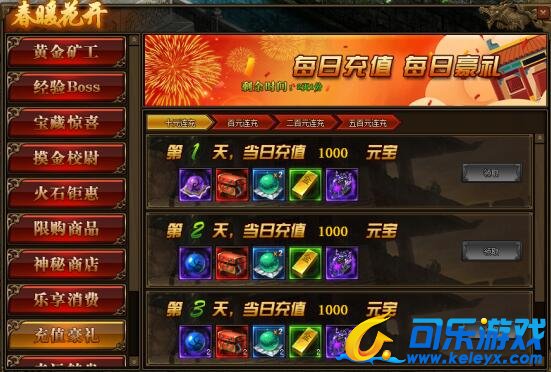 2.连续充值达到3天,奖励翻倍领,更可领取暗影晶石、地狱晶石、雷霆装备等贵重物品