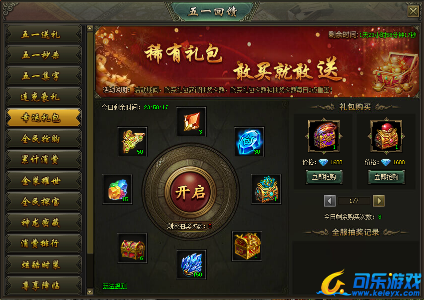 活动说明:活动期间,购买礼包获得抽奖次数,购买礼包次数和抽奖次数每日0点重置。