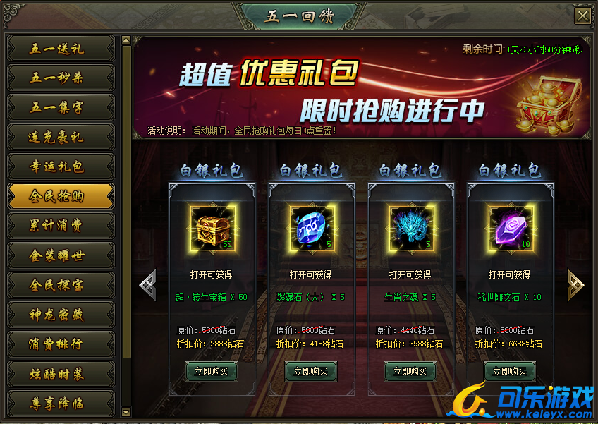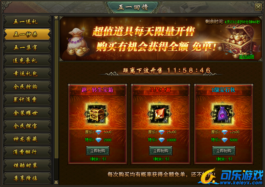 活动说明:活动期间,超值道具每天限量开售,每次购买都有机会全额免单