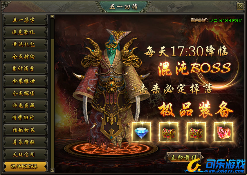 活动说明:活动期间,每天17:30降临混沌BOSS,击杀必定掉落极品装备