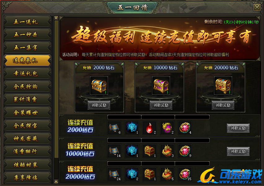 活动说明:活动期间,每天累计充值到指定档位即可领取奖励,连续3天充值到指定档位即可领取超级奖励