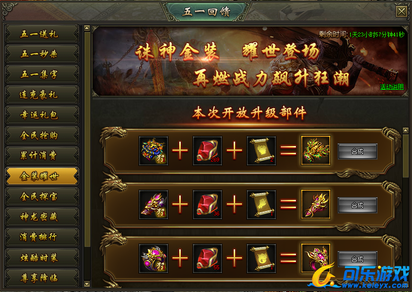 活动说明:活动期间,开放诛神金装合成,战力疯狂飙升