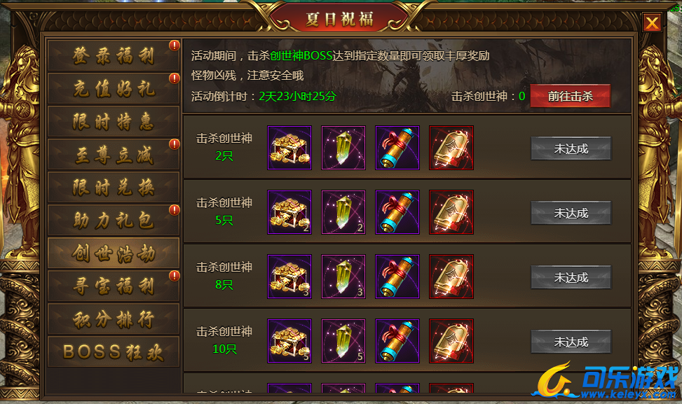 1.活动期间击杀指定数量的创世神即可获得奖励