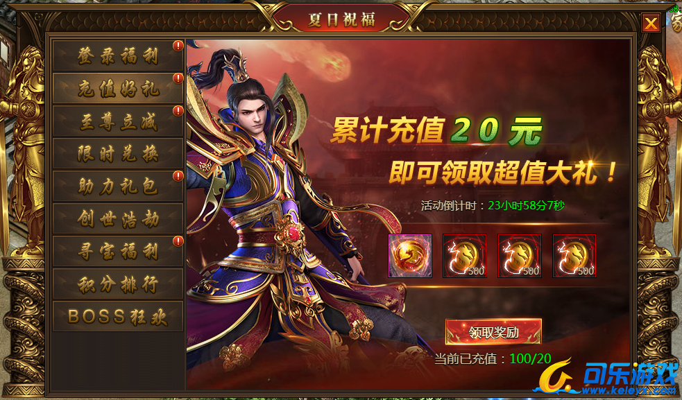 1.活动期间,玩家每日充值20、200、500元,均可领取超值大礼;
