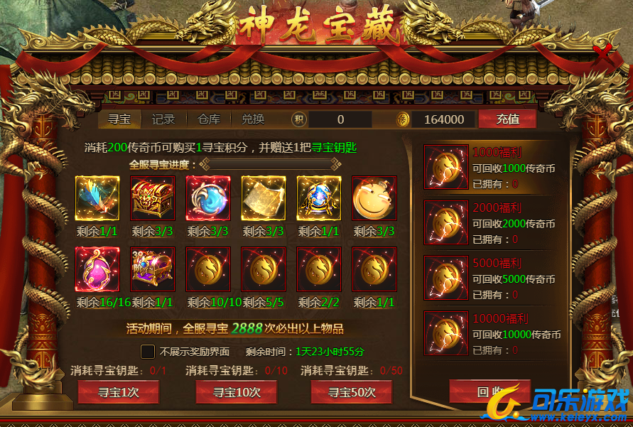 1.活动期间可以在神龙宝藏中抽取各种稀有道具、装备和传奇币