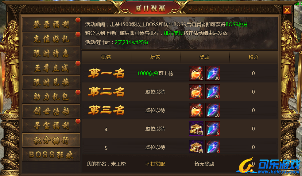 1.活动期间击杀1500级以上的boss和转生boss获得积分,活动结束后更加排行邮件发送奖励