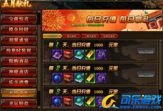2.连续充值达到3天,奖励翻倍领,更可领取暗影晶石、地狱晶石、随机7级阵法宝珠、雷霆装备等贵重物品