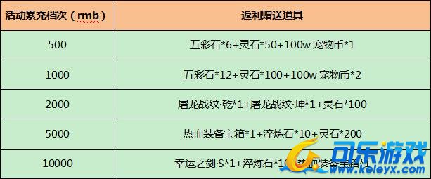活动规则:活动期间累计领取元宝达到指定价值档次,即可在活动结束后联系客服申请返利道具