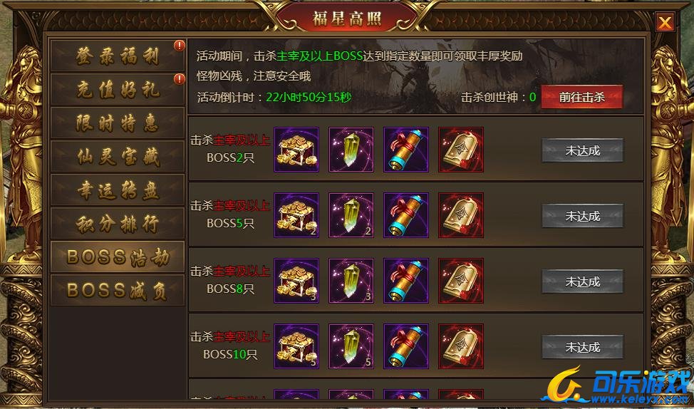 活动内容:活动期间击杀主宰及以上BOSS达到指定数量即可领取奖励
