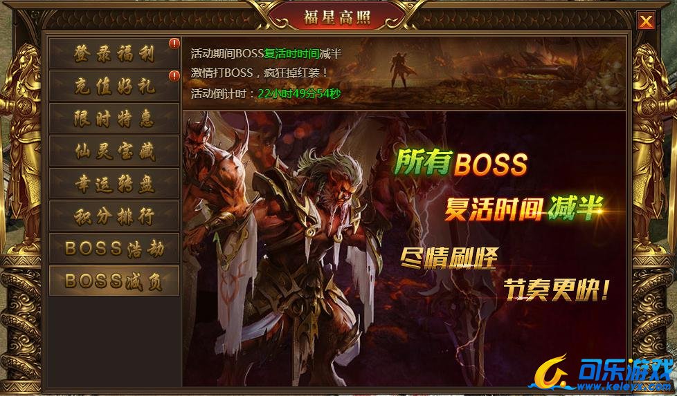 活动内容:活动期间BOSS复活时间减半(跨服BOSS除外)