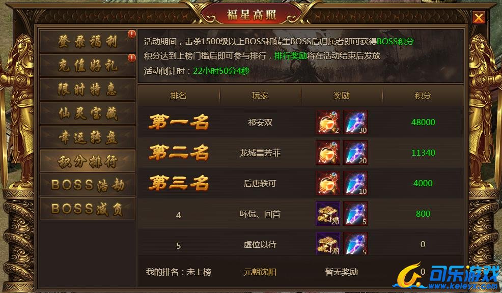 活动内容:活动期间击杀1500级以上的boss和转生boss获得积分,活动结束后更加排行邮件发送奖励