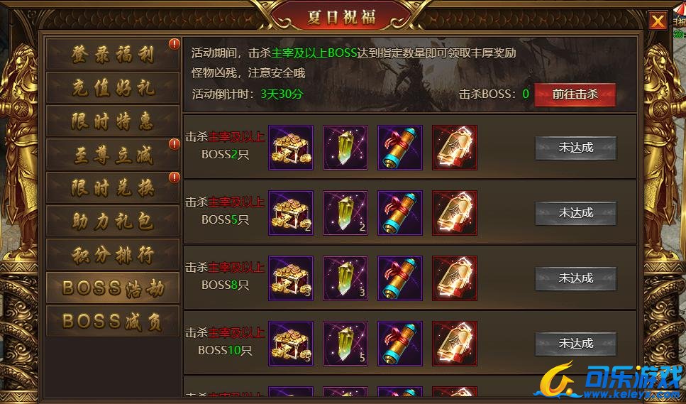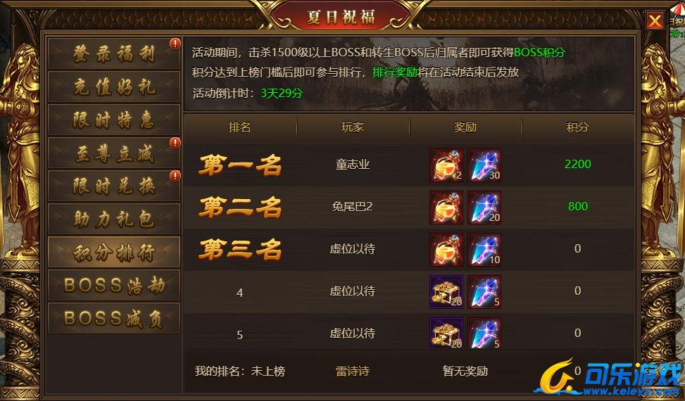 1.活动期间击杀1500级以上的boss和转生boss获得积分,活动结束后更加排行邮件发送奖励