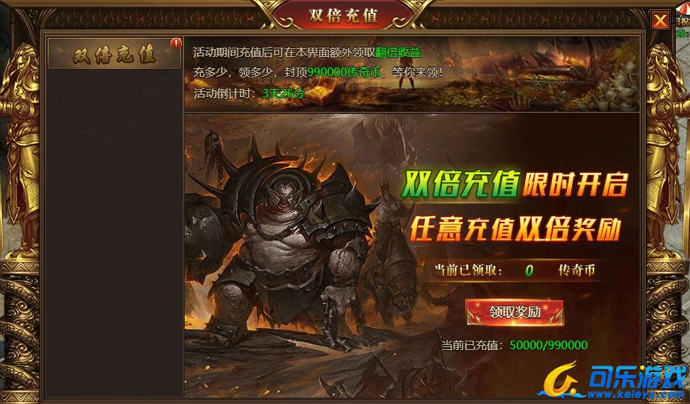 1.活动期间充值可在活动页面领取与充值金额等值的传奇币奖励