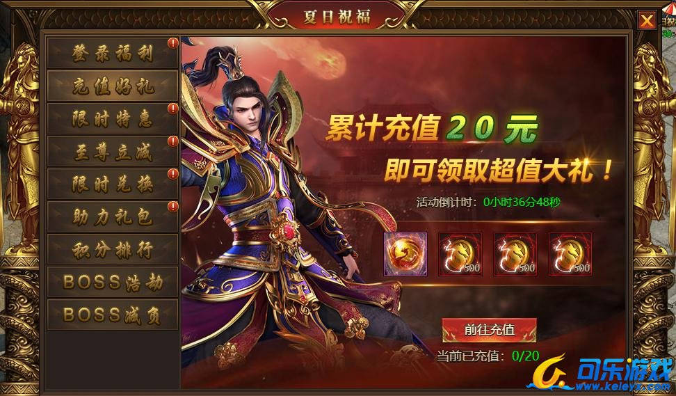 1.活动期间,玩家每日充值20、200、500元,均可领取超值大礼;