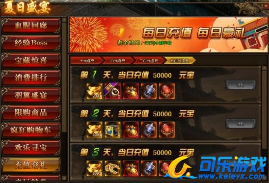 2.连续充值达到3天,奖励翻倍领,更可领取暗影晶石、地狱晶石、随机7级阵法宝珠、雷霆装备等贵重物品