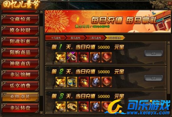 2.连续充值达到3天,奖励翻倍领,更可领取暗影晶石、地狱晶石、雷霆装备等贵重物品